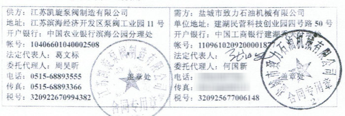 江蘇凱旋泵閥制造有限公司與鹽城致力石油機(jī)