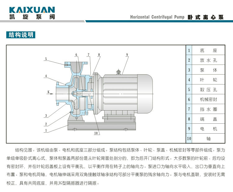 葉輪直接安在電機(jī)的加長軸上,軸向尺寸短,結(jié)構(gòu)緊湊,泵與電機(jī)軸承配置合理,能有效地平衡泵運(yùn)轉(zhuǎn)產(chǎn)生的徑向和軸向負(fù)荷,從而保證了泵的運(yùn)行平穩(wěn),振動(dòng)噪音很低。