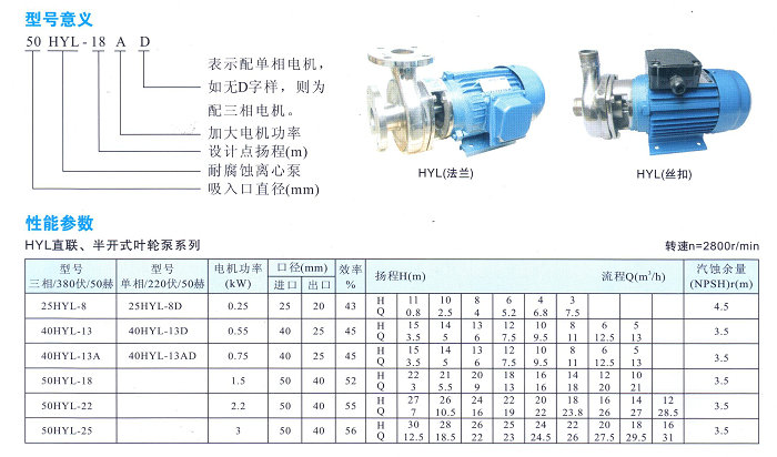 HYL不銹鋼耐腐蝕化工離心泵性能參數(shù):